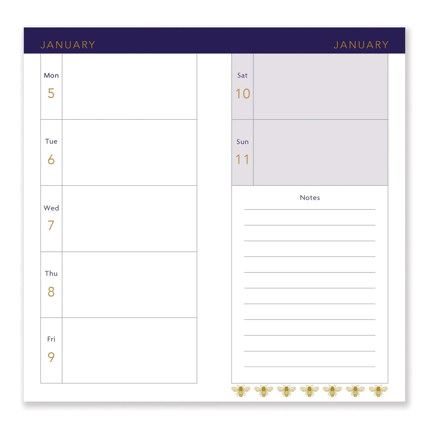 The bee’s timeless appeal shines through in this simple yet sophisticated diary, featuring an intricate gold foil icon on the cover. With a handy marker ribbon and a week across 2 pages, this compact planner still gives plenty of space for all your appointments and plans.