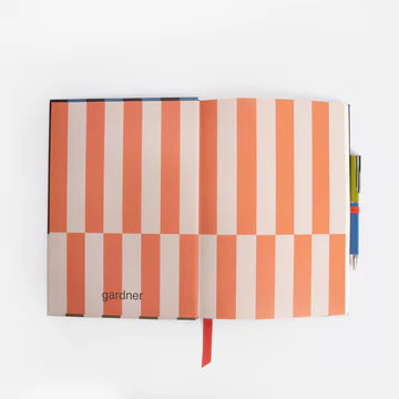 Keep your notes safe in something stylish with our new bold stripe notebook & pen set. This casebound notebook comes with 100 lined pages, contrast stripe inner page with pocket and ribbon page marker, and also a matching colour block refillable ballpoint pen.