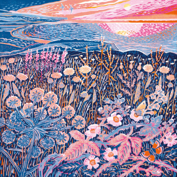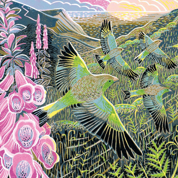 8 notecards, 2 designs featuring a field and flying birds by Annie Soudain.