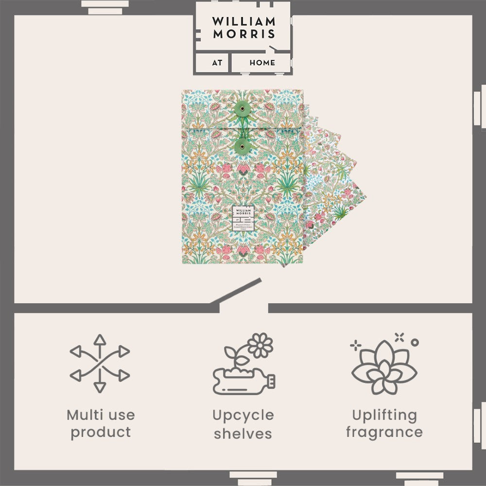 A vibrant set of five William Morris Bergamot & Vetiver scented drawer liners. Perfect to upcycle and freshen drawers and cupboards with iconic heritage prints and uplifting fragrance, makes a unique gift for the homemaker.