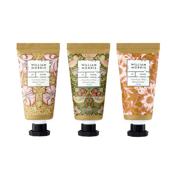 A perfect hand care gift for heritage design lovers. Three vegan hand creams featuring designs by William Morris: iconic Strawberry Thief, Carnation and Flowering Scroll recoloured in natural and warm earthy hues.