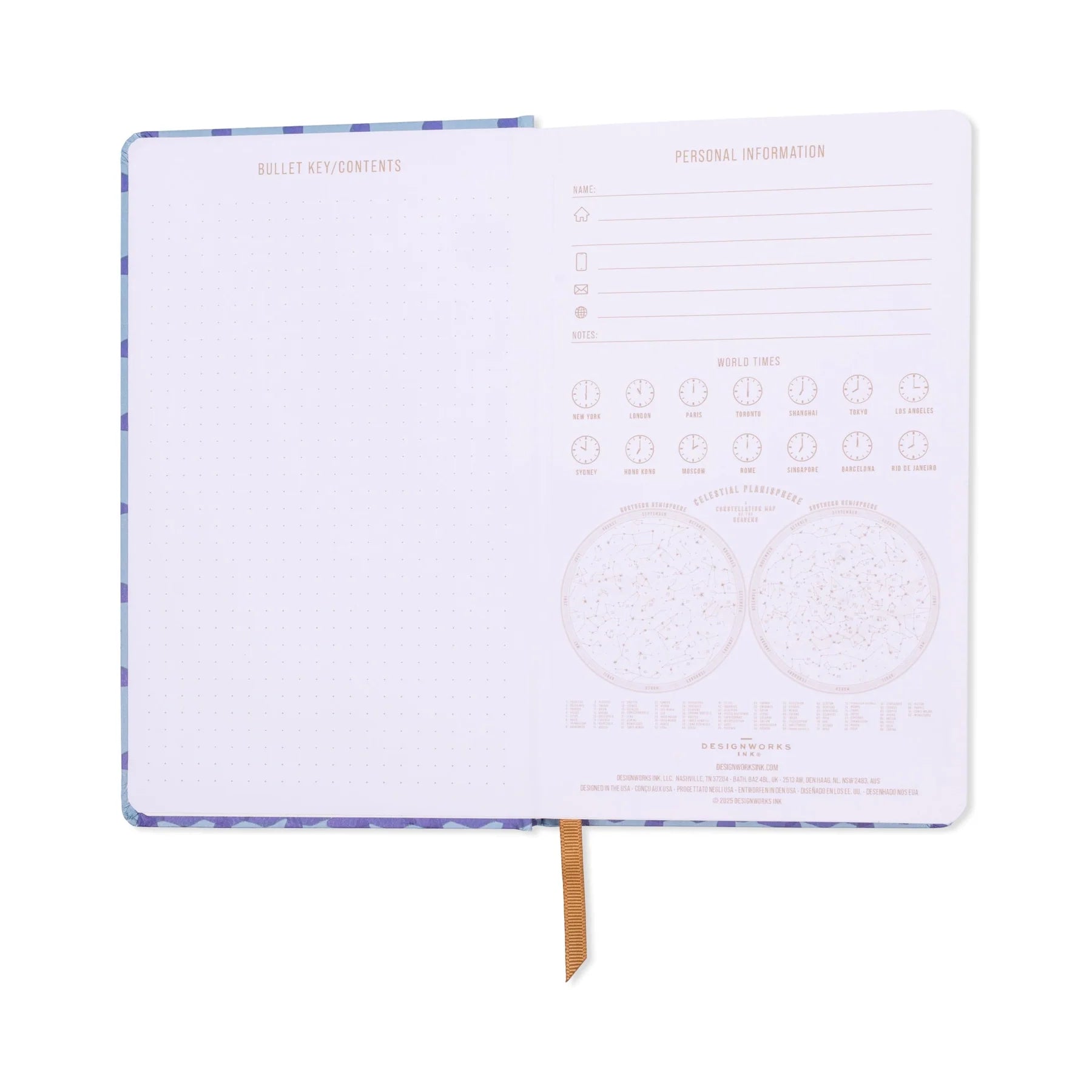 • 256 Lined Pages with Ribbon Marker • Informational Pages • Sewn, Lay-Flat Binding • Textured Art Paper Cover • Printed with Soy Based Inks on 100 GSM Uncoated Woodfree, Lignin-Free, Acid-Free Paper