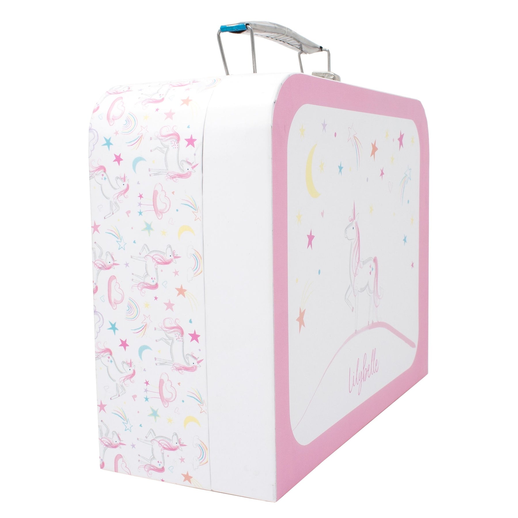 Sturdy suitcase is made of thick cardboard with a metal handle and lock making a great keepsake that is fun for children to play with, and looks super stylish as a fun decoration!