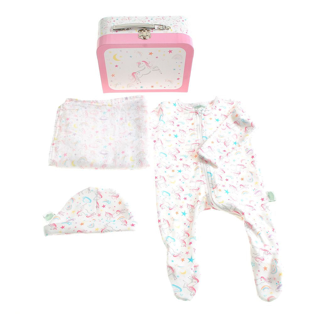 This delightful suitcase bundle contains: a zipped all-in-one suit, hat, and muslin cloth to match.