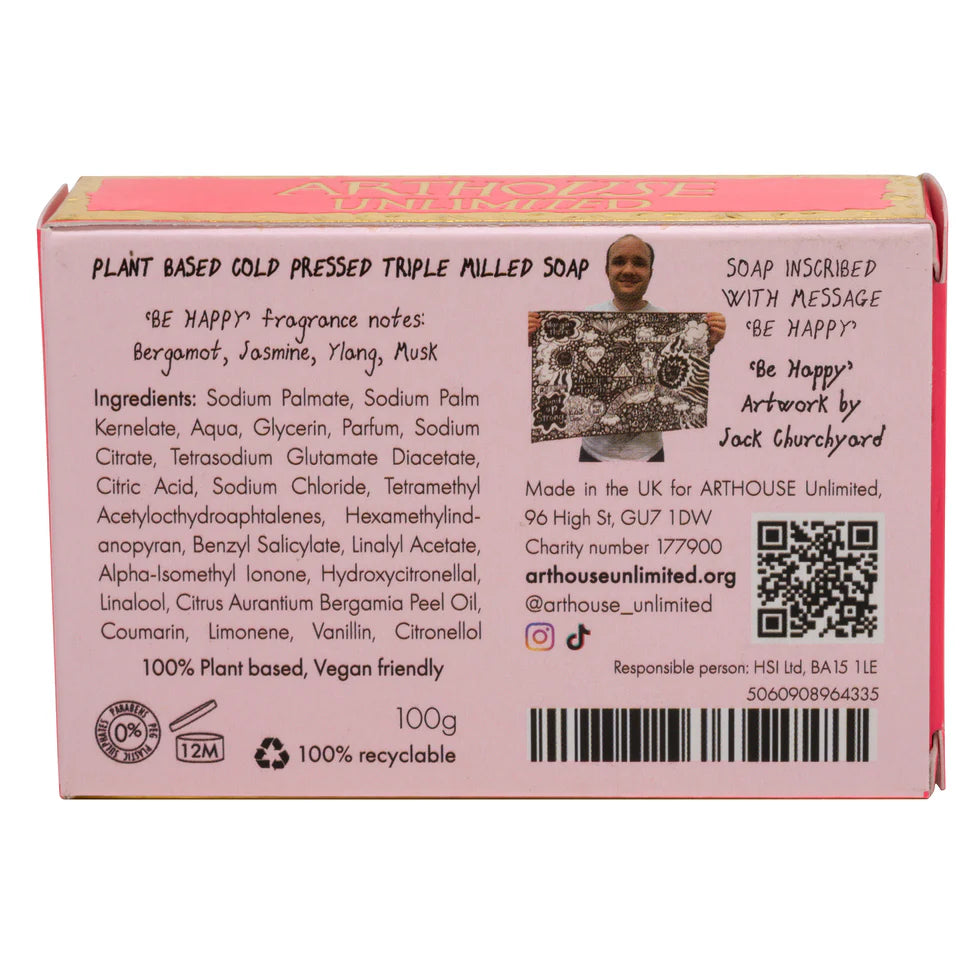 This opulent plant based cold pressed soap, is gently fragranced with Bergamot, Jasmine, Ylang and Musk. Featuring Jack Churchyard's 'Be Happy' artwork, the 100g paraben-free soap is triple milled for a longer-lasting luxurious lather.