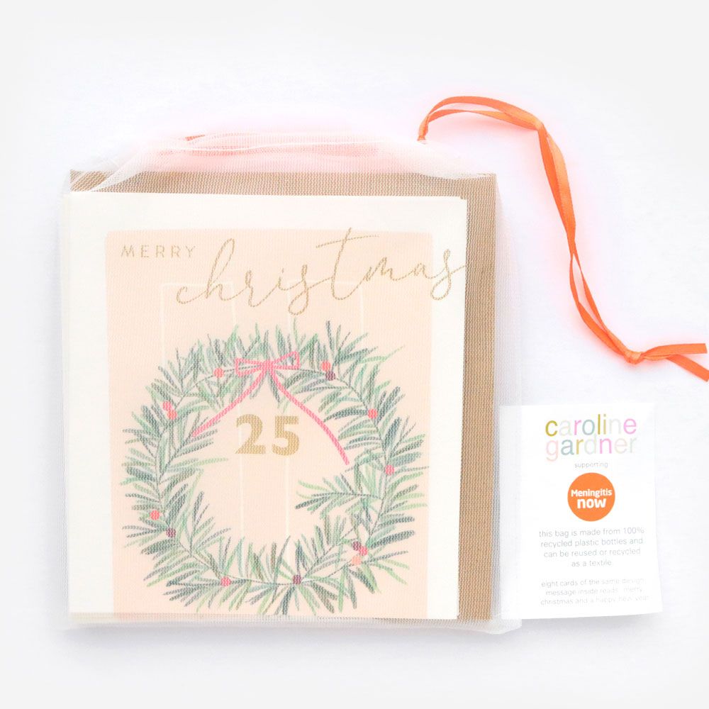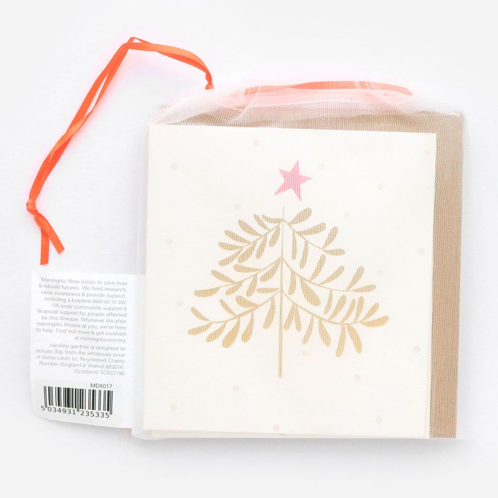 Each pack contain 8 cards consisting of 2 pre-selected designs, featuring a selection of metallic foiling or embossed finishes and supplied in our eco-pouch. Printed on fsc board and supplied with our new red & white striped or gold envelopes depending on design. These cards are suitable for letter post. Each card has the festive message 'merry christmas and a happy new year' printed on the inside. These charity cards have the Meningitis Now logo printed on the inside & 30p is donated for every pack sold.