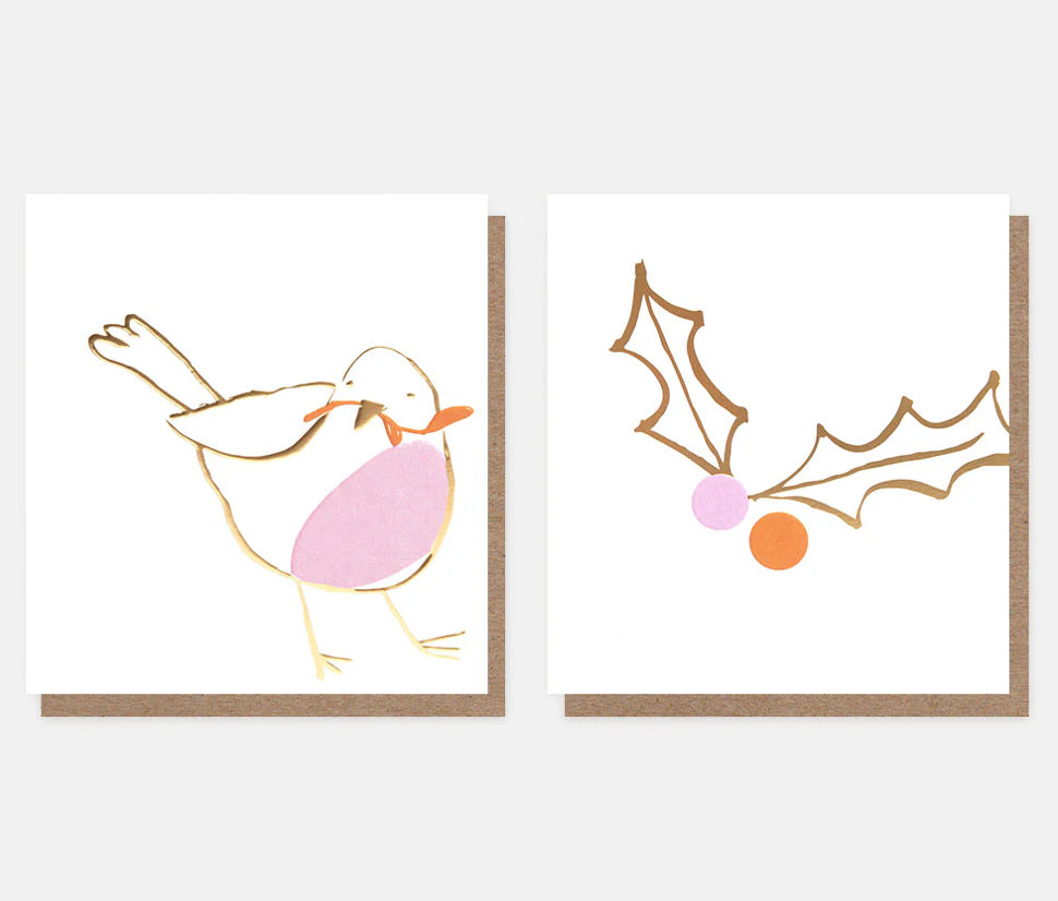 These charity Christmas card packs contain 8 cards each with the message 'merry christmas and a happy new year' inside. Choose from a gold & lilac robin or holly designs, with 4 of each contained in the box.