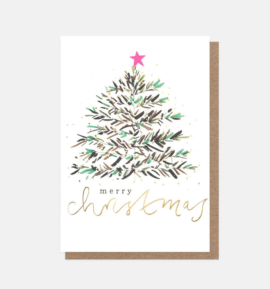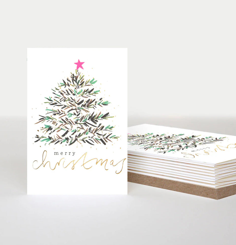 These small and cute Christmas cards come in a pack of 10, featuring a design of a painted tree with gold snow and a pink star. Finished with gold foil lettering and left blank inside for your own personal message.