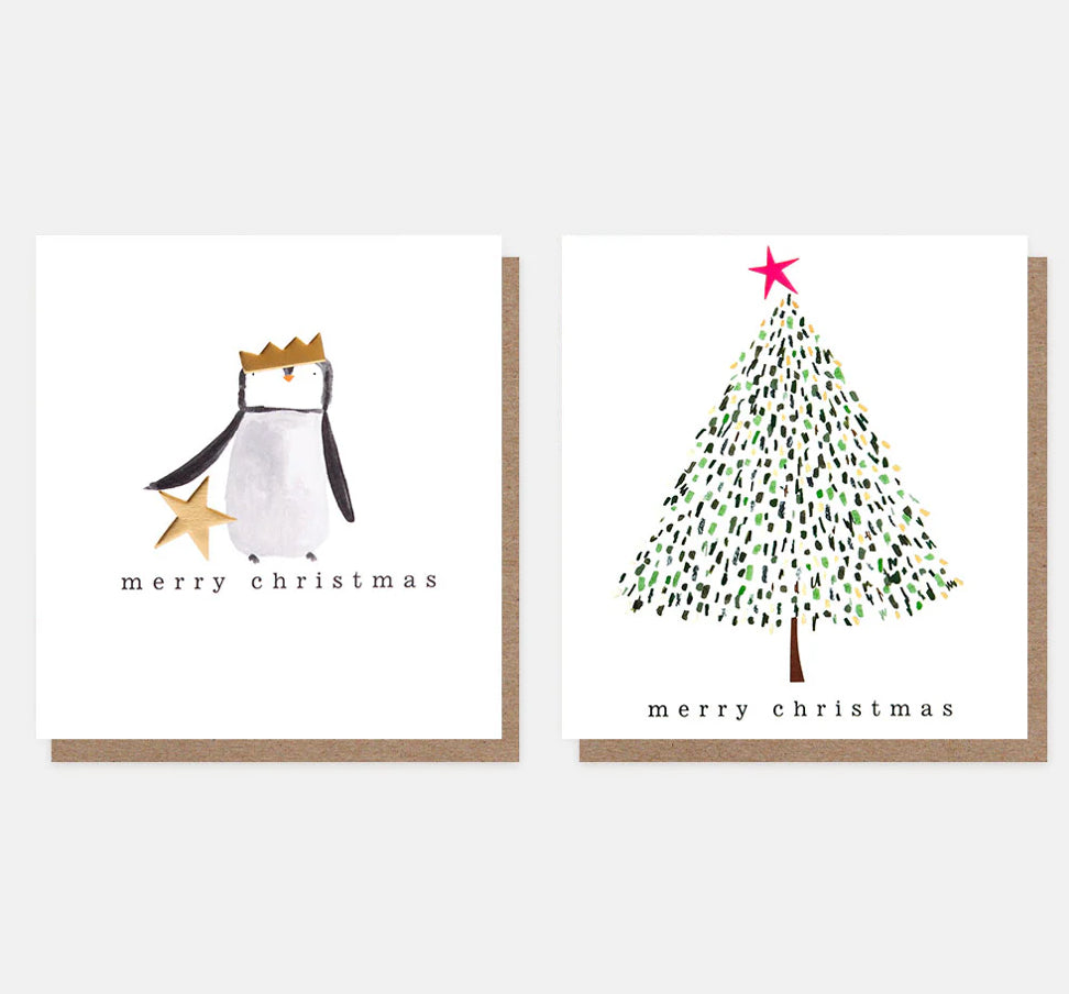 These charity Christmas card packs contain 8 cards each with the message 'merry christmas and a happy new year' inside. Choose from a cute penguin with a star or christmas tree designs, with 4 of each contained in the box.