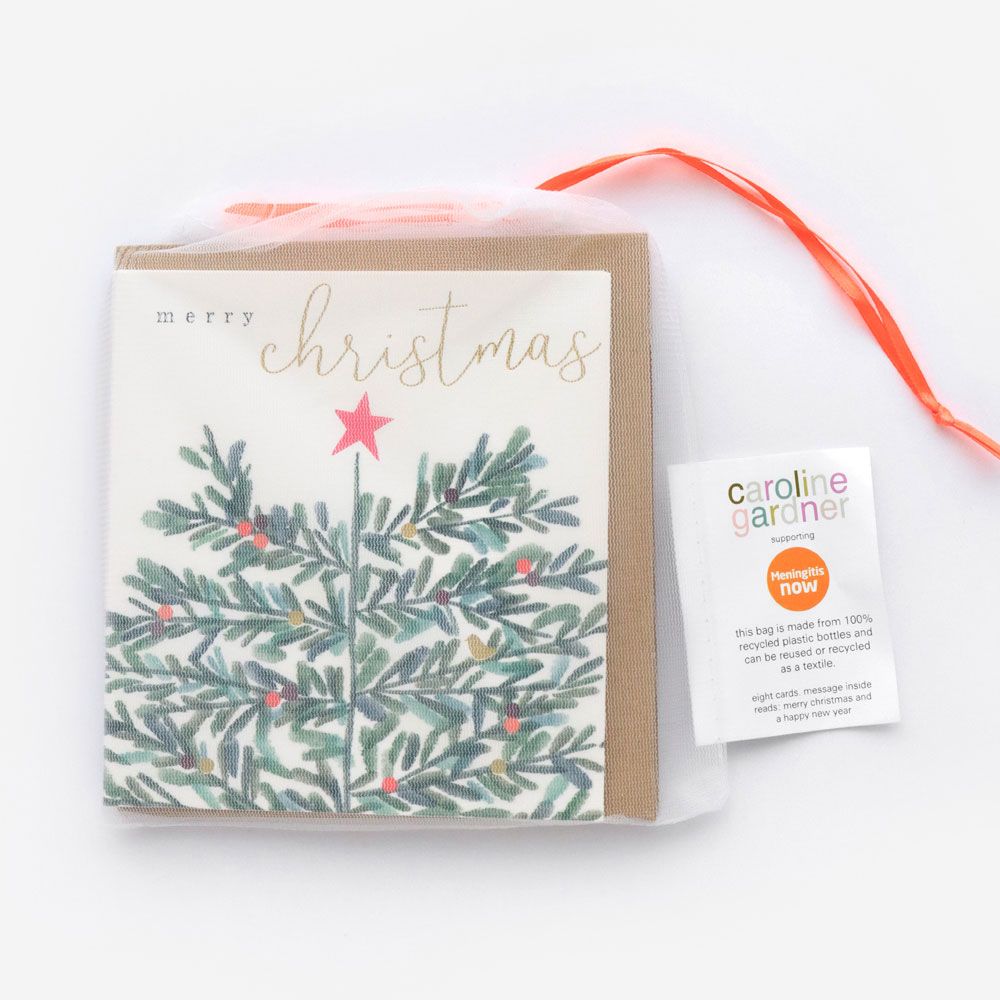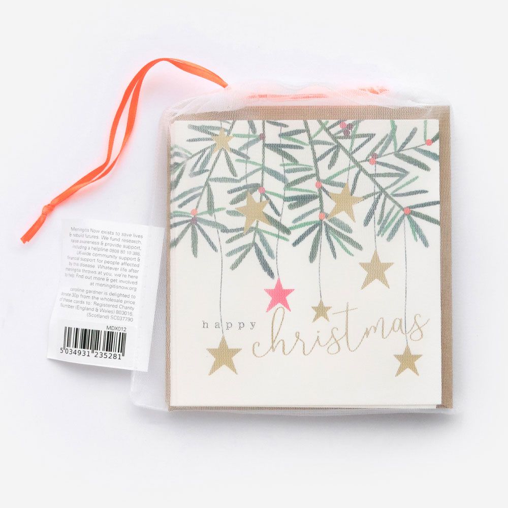 Each pack contain 8 cards consisting of 2 pre-selected designs, featuring a selection of metallic foiling or embossed finishes and supplied in our eco-pouch. Printed on fsc board and supplied with our new red & white striped or gold envelopes depending on design. These cards are suitable for letter post. Each card has the festive message 'merry christmas and a happy new year' printed on the inside. These charity cards have the Meningitis Now logo printed on the inside & 30p is donated for every pack sold.