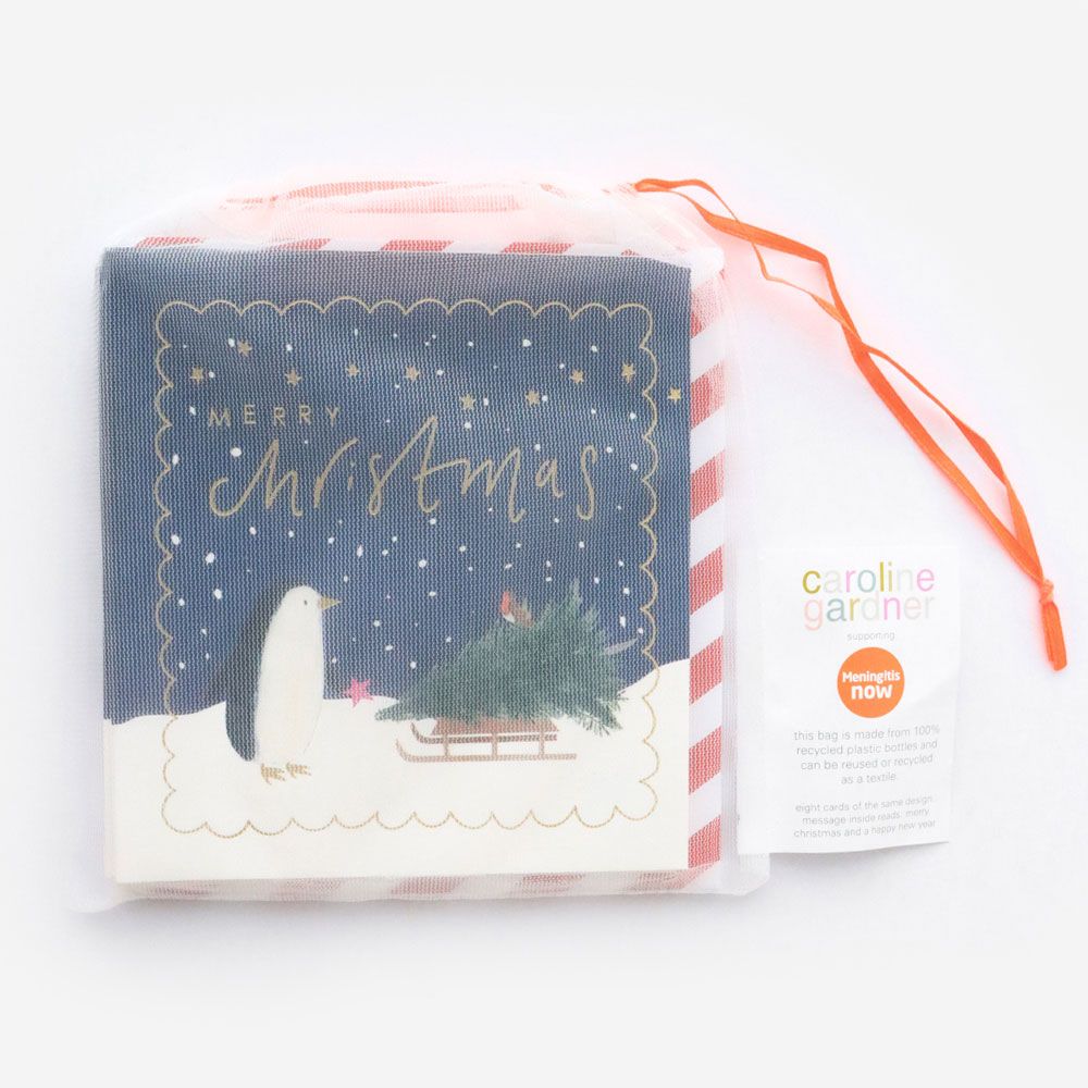 Sold in packs of 8 with a selection of metallic foiling and embossed finishes and supplied in our eco-pouch. Printed on fsc board and supplied with new red & white striped envelopes. These cards are suitable for letter post. Each card has the festive message 'merry christmas and a happy new year' printed on the inside. These charity cards have the Meningitis Now logo printed on the inside & 30p is donated for every pack sold.
