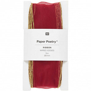 ‘Paper Poetry’ Organza Ribbon Dark Red w Gold Wired Edge