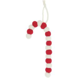 Crafted entirely of sheep's wool, this candy cane hanger, made from red and white felt balls, adds a festive and decorative touch to any Christmas decor.