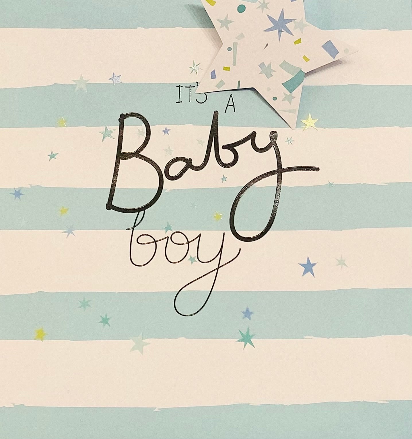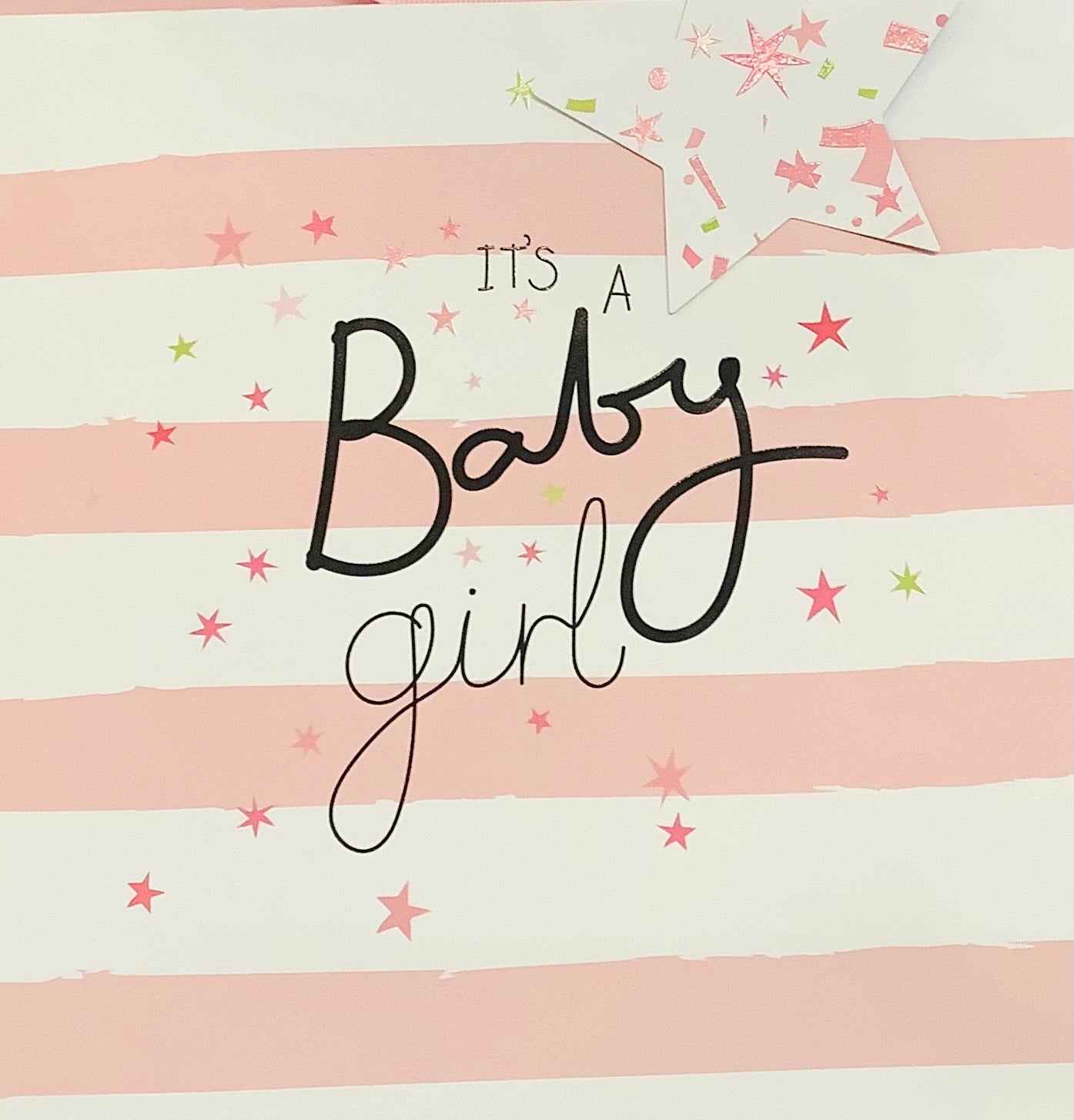 This gift bag from Belly Button Designs features blue and white or pink and white stripes, a star shaped gift tag and ribbon handles.