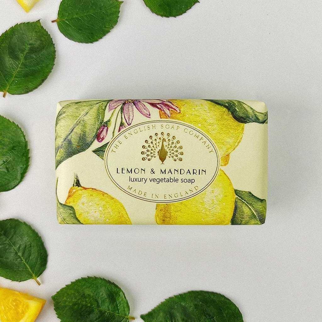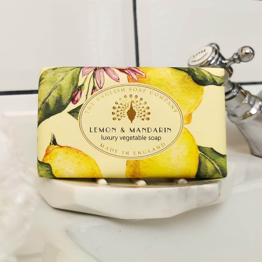 Indulge in the everyday use of a vegan friendly, luxury soap bar. Made using pure vegetable oils and enriched with shea butter to keep your skin feeling nourished. This Vintage Lemon and Mandarin Soap is part of our Vintage Collection. A collection of soaps designed to capture traditional styles, wrapped in fully recyclable paper, and decorated with vintage-inspired artworks. A sumptuous treat for yourself or a token gift for a loved one.