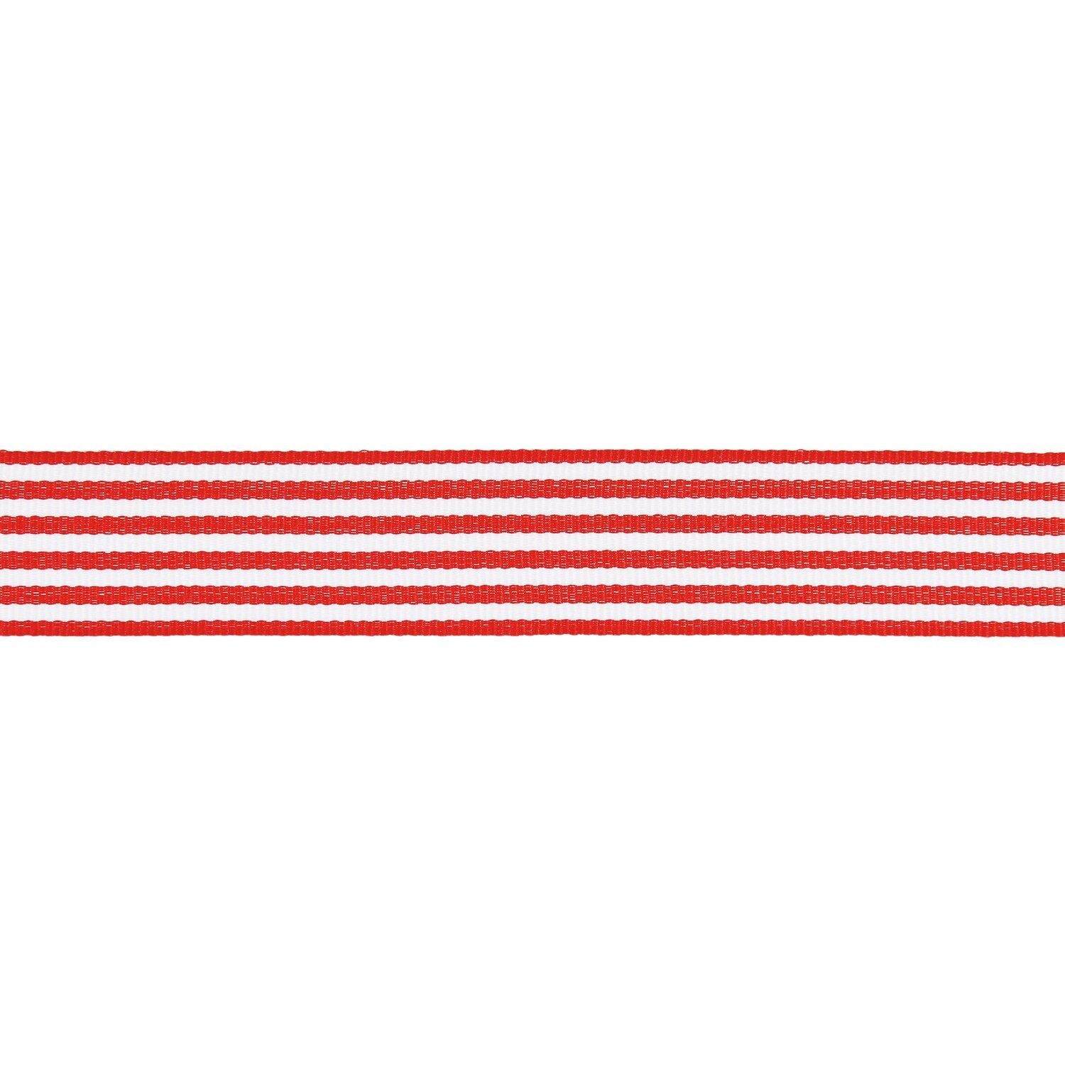 The ribbon with duo-stripes in red and white is 25 mm wide and 3 m long. Made from 100% polyester, it comes in plastic-free packaging. It's perfect for gift wrapping, crafting, and decorating projects .